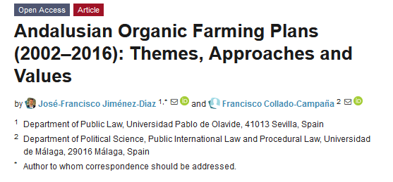 El artículo titulado «Andalusian Organic Farming Plans (2002–2016): Themes, Approaches and Values» escrito por José Francisco Jiménez (Universidad Pablo de Olavide) y Francisco Collado (Universidad de Málaga), y publicado recientemente en Sustainability, estudia los enfoques ideológicos tras los planes de agricultura ecológica desarrollados por la Junta de Andalucía durante las dos primeras décadas del siglo XXI. Esta investigación desarrolla un muestreo teórico-cualitativo a través de una selección de 109 palabras clave que están presentes en dicho documento para el análisis de contenido. De este modo, los autores han detectado numerosos temas relacionados con la agricultura ecológica y los han clasificado en seis campos semánticos vinculados a diversos enfoques y valores promovidos por la Administración autónoma andaluza, entre los que se observa como los paradigmas ecológicos de los primeros planes han ido evolucionando hacia perspectivas más tecnocráticas de la sostenibilidad ambiental en torno al agro andaluz.