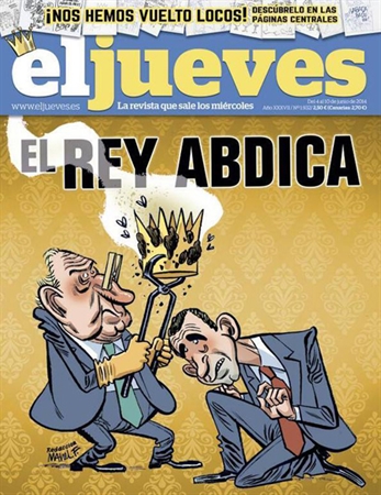 Por tanto, es un crimen contra la democracia, contra la libertad de expresión, lo que ha acontecido en la redacción de El jueves hace unos días. La dimisión en cadena de Manel Fontdevila, Albert Monteys, Paco Alcázar, Manuel Bartual, Bernardo Vergara, Guillermo e Isaac Rosa ante la decisión de RBA de retirar la portada en la que Juan Carlos hacía entrega de una pútrida corona al heredero Felipe. Este hecho, es una violación de libertades propia de repúblicas bananeras, de regímenes bolivarianos y poco oportuno de países que se digan democráticos. Ahora no es el momento de remover la monarquía, pero sí es el momento de meditar en relación a los miembros de tan feudal estructura cuál es el lugar que ocupan como parte de los poderes.